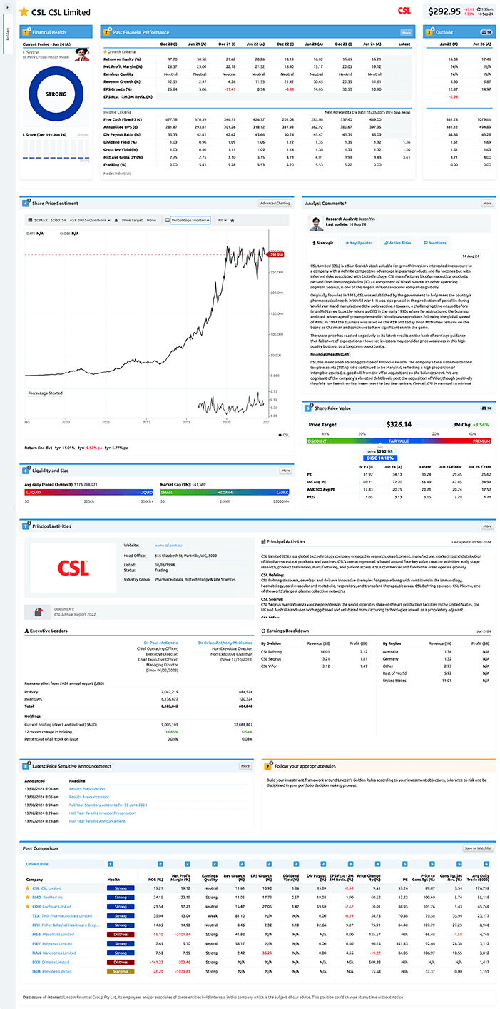 The most important aspect of Stock Doctor is the unique Financial Health methodology used to analyse each company’s Balance Sheet, Cash Flow and Profit and Loss statements. Dr Merv Lincoln’s academically proven methodology, developed after years of industry research and covering three economic cycles, is also widely used by corporate Australia in the area of risk management.